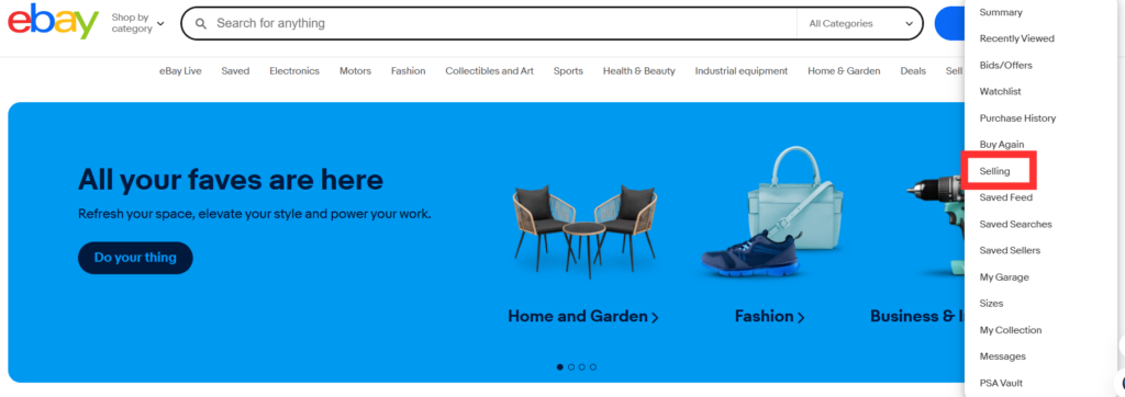 画面右上の「My eBay」にカーソルを合わせ、プルダウンから「Selling」を選びます。