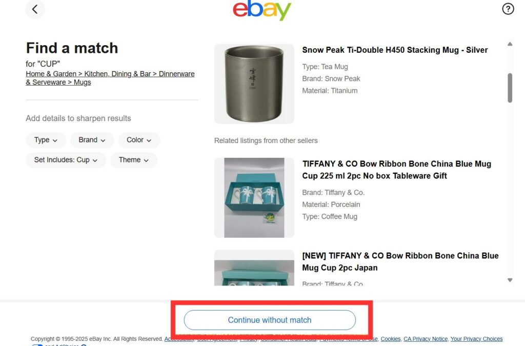 該当商品がない場合「Continue without match」をクリックしましょう。