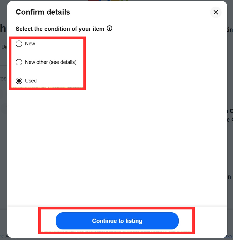 商品状態を選ぶ画面に切り替わるので、適切な状態を選択し「Continue to listing」をクリックしましょう。
