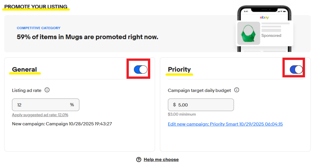 「PROMOTE YOUR LISTING」では、商品を有料プロモーションにより検索結果の上部などに優先表示させる設定が可能です。