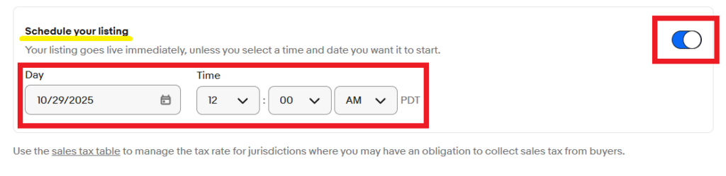 「Schedule your listing」は、出品した商品をすぐに公開せず、指定した日時に自動で公開できる機能です。