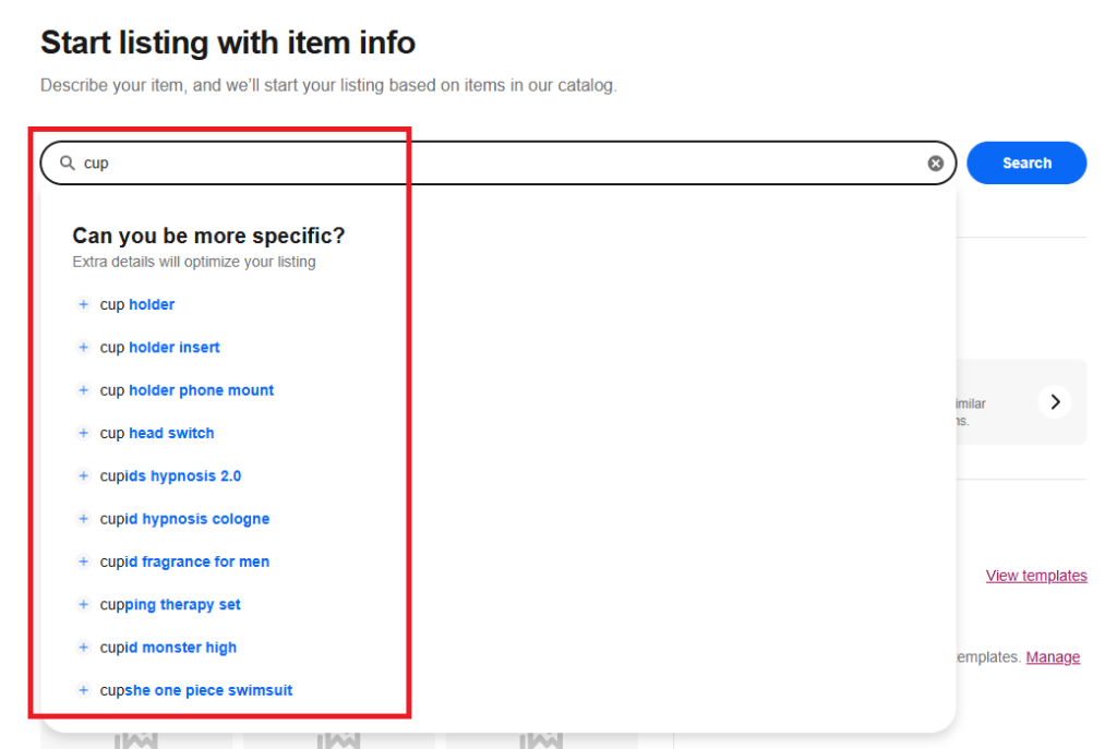 該当商品がある場合、それを選択することで「Item specifics(商品詳細情報)」などが既に入力されているものをテンプレートして使用できます。