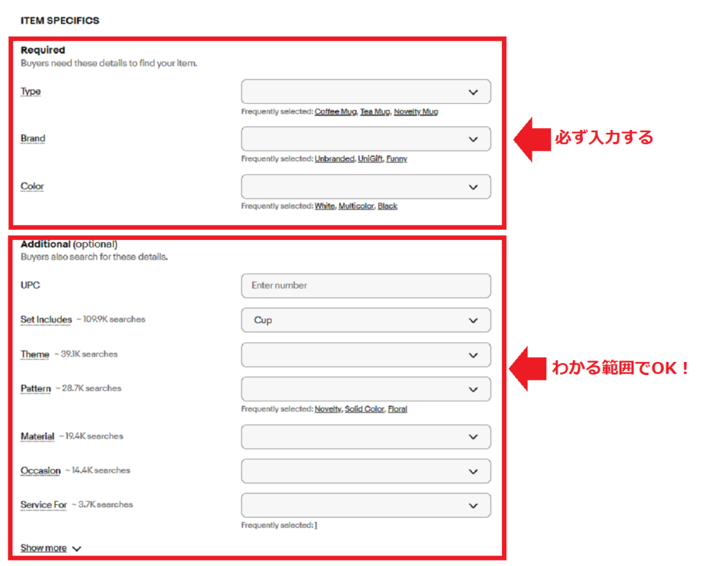 「ITEM SPECIFICS」は出品する商品によって項目が異なり、すべて入力する必要はありません。
