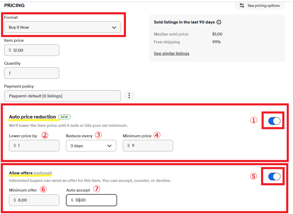 ①ボタンを有効にし、⓶に1回ごとに値下げする金額、③に何日ごとに値下げするか、④に自動値下げの下限を入力します。