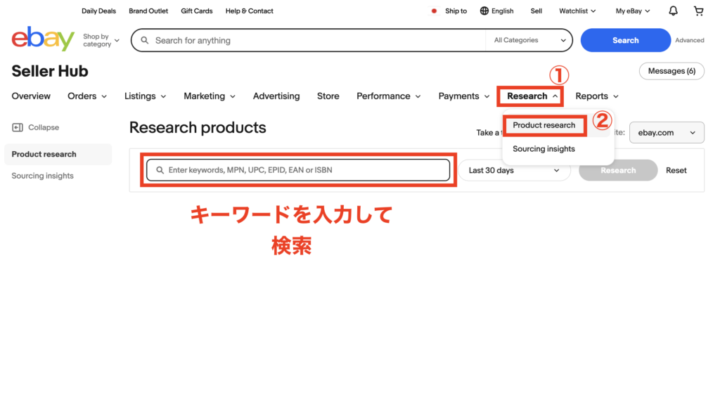 Product Research(旧テラピーク)は、セラーハブのメニュー>①Research>②Product Researchの順にクリックし、キーワードを入力するだけで使えるので、ぜひ使ってみてください!