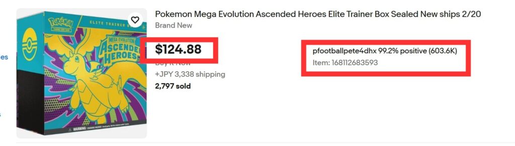 すると、セラーIDとアイテムナンバーが表示されて価格が日本円から$に表記変更されます。