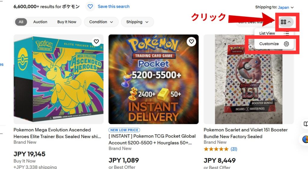 実際にeBayで「Pokemon」という検索ワードで日本人セラーに絞り込んで検索した結果、以下のように8,702件の商品が出てきました。